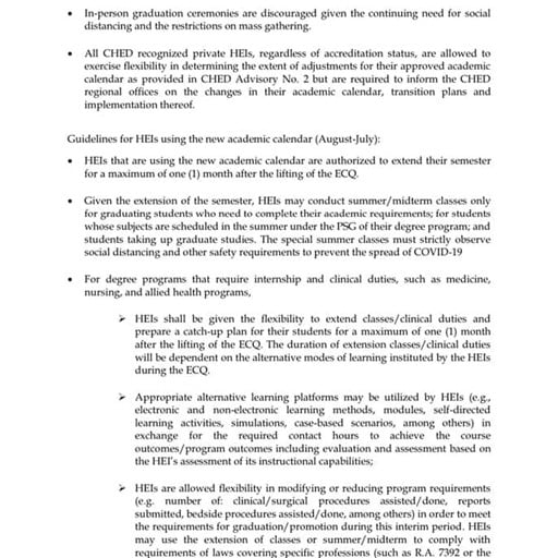 The following document is a general statement about the on-the-job training activities and internships; guidelines for HEIs using the old and new academic calendar; as well as guidelines for the preparation of HEIs for the return of classes after lifting the community quarantine.