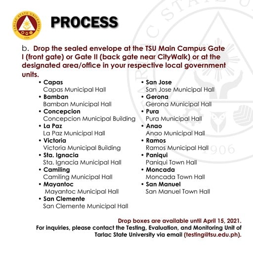 B. Drop the sealed envelope at the 𝗧𝗦𝗨 𝗠𝗮𝗶𝗻 𝗖𝗮𝗺𝗽𝘂𝘀 𝗚𝗮𝘁𝗲 𝗜 (𝗳𝗿𝗼𝗻𝘁 𝗴𝗮𝘁𝗲) 𝗼𝗿 𝗚𝗮𝘁𝗲 𝗜𝗜 (𝗯𝗮𝗰𝗸 𝗴𝗮𝘁𝗲 𝗻𝗲𝗮𝗿 𝗖𝗶𝘁𝘆𝗪𝗮𝗹𝗸) or at the designated area/office in your𝗿𝗲𝘀𝗽𝗲𝗰𝘁𝗶𝘃𝗲 𝗹𝗼𝗰𝗮𝗹 𝗴𝗼𝘃𝗲𝗿𝗻𝗺𝗲𝗻𝘁 𝘂𝗻𝗶𝘁𝘀.