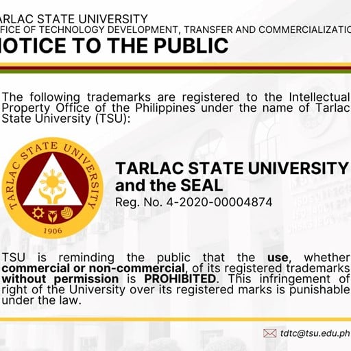 The following trademarks are registered to the Intellectual Property Office of the Philippines under the name of TARLAC STATE UNIVERSITY (TSU)