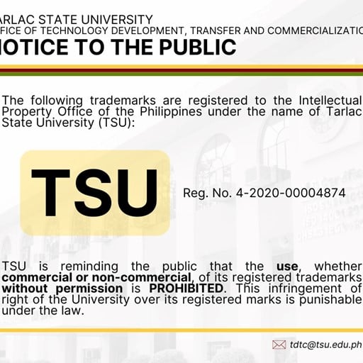 TSU is reminding the public that the use, whether commercial or non-commercial, of its registered trademarks without permission is PROHIBITED. This infringement of right of the University over its registered marks is punishable under the law.