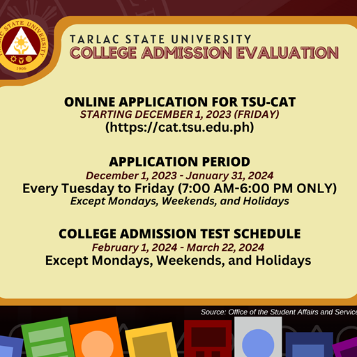 The online application for the Tarlac State University College Admission Evaluation or TSU-CAE will start on December 1, 2023 (Friday) until January 31, 2024 (Wednesday).
