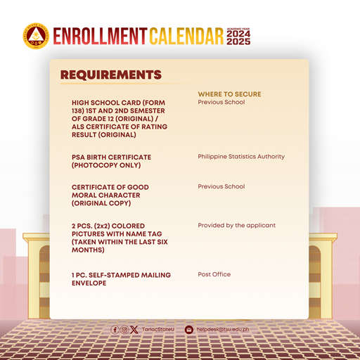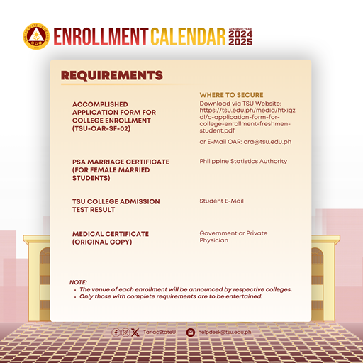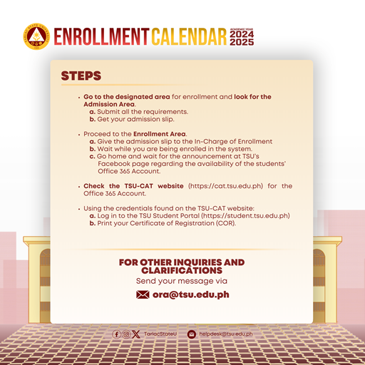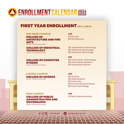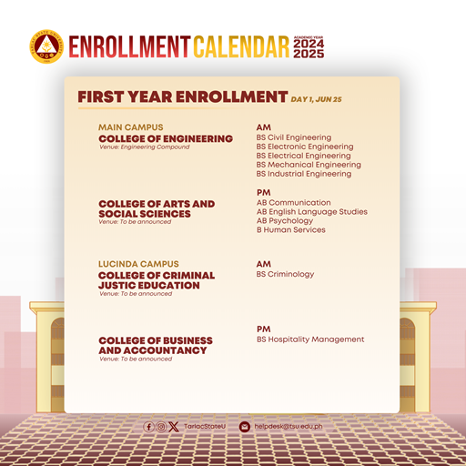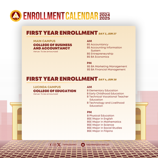 All qualified TSU-CAE applicants who have successfully confirmed their slots are advised to follow the enrollment schedule from June 25 to 28, 2024 (8:00 AM to 5:00 PM).