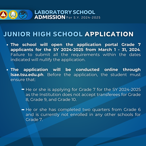The online application for Tarlac State University-Laboratory School Admission Evaluation (TSU LSAE) will open on March 1, 2024 (Friday).