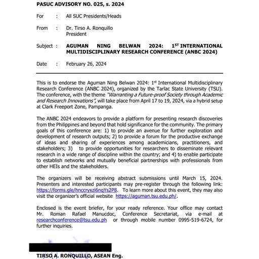 The Tarlac State University, through the Office of University Research Development, cordially invites all researchers from around the globe to join the ANBC 2024: TSU 1st International Multidisciplinary Research Conference on April 17-19, 2024, at the Clark Freeport and Special Economic Zone, Philippines and via Zoom Teleconferencing.